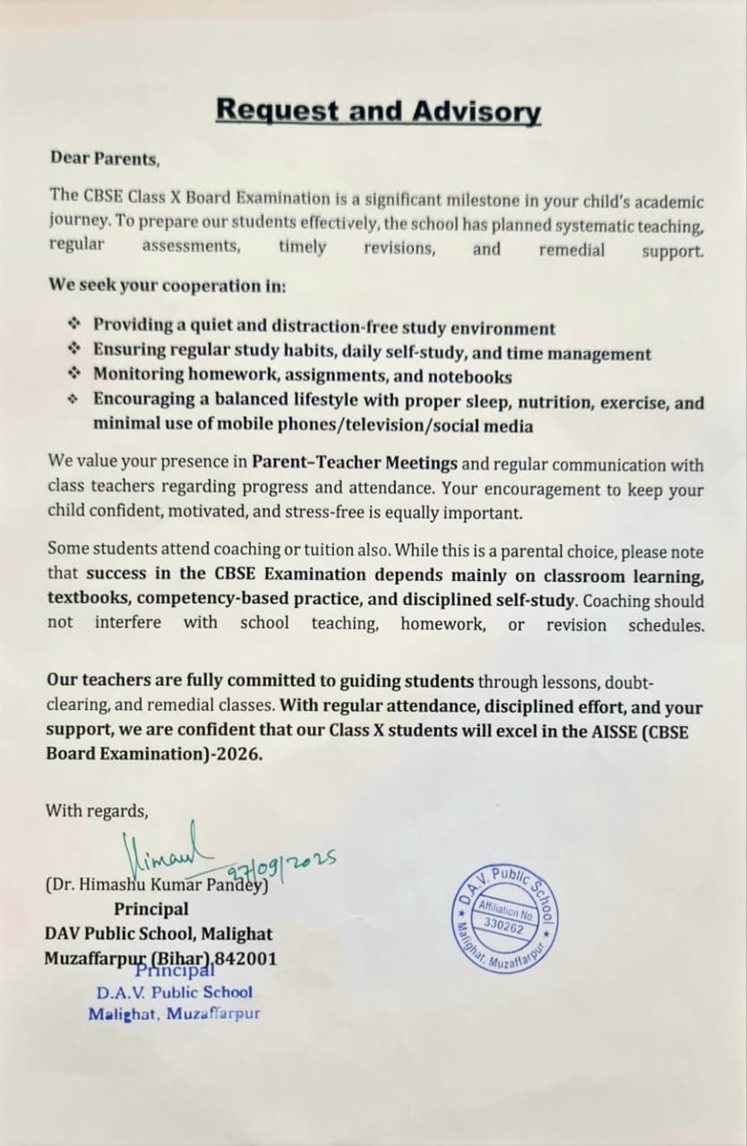 DAV Public School, Malighat Near BMP-6 Malighat, Muzaffarpur, Bihar E-Mail :- [email protected] Website :- www.davpsmalighat.com Contact No:- 9263182202, 7543821043